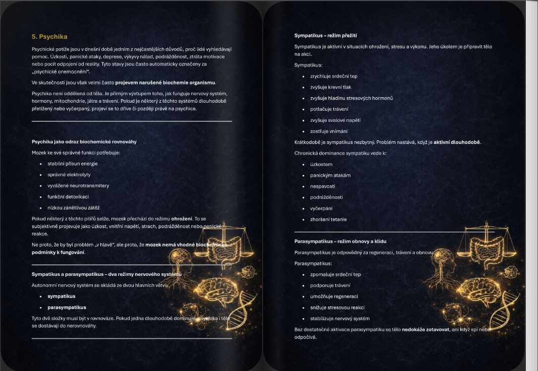 - Úzkosti, deprese, panické ataky, vyhoření, mozkovou mlhu (brainfog), zhoršenou koncentrace, výkyvy nálad, poruchy spánku, nervozita